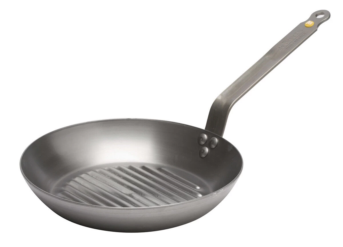 De ronde De Buyer B-Element grillpan is van plaatstaal en heeft een diameter van 26 cm. Dit materiaal warmt snel op en verdraagt hoge temperaturen. Gebruik de pan voor het grillen en bakken van bijvoorbeeld gevogelte, vlees en groenten. Vet uw producten voor het bakken in met olie, niet de grillplaat; hierdoor voorkomt u verbranding van de olie. De pan is voorzien van een beschermende laag bijenwas die voor gebruik verwijderd dient te worden. Deze laag voorkomt roestvorming in de pan vóór gebruik.