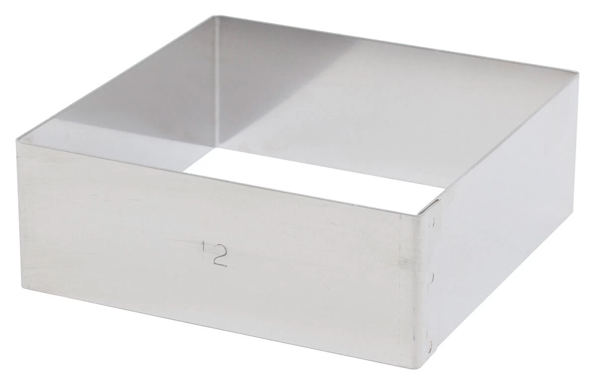 De vierkante taartring van De Buyer is van roestvrij staal met de volgende afmetingen: 12 x 12 x 4,5 cm. Gebruik de ring voor het bakken van vierkante taarten of het uitsteken van deeg.