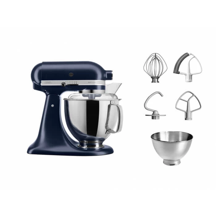De Inktblauwe KitchenAid Artisan Elegance KSM175 standmixer is vervaardigd uit gegoten zink met een matte, blauwe coating. De machine wordt geleverd met twee roestvrijstalen mengkommen, één van 4,8 liter en één van 3 liter. Aan de voorzijde van de mixer bevindt zich een aansluitpunt voor de vele accessoires waarmee u van de KitchenAid een multifunctionele keukenmachine maakt. Deze keukenrobot mengt, roert, klopt en kneedt met groot gemak uw deeg, beslag, saus of room.