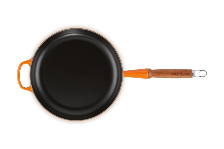 Deze vulcanique, oranje, koekenpan van Le Creuset heeft een diameter van 26 cm en is gemaakt van geëmailleerd gietijzer. In tegenstelling tot de andere koekenpan rond van Le Creuset heeft deze koekenpan een open tegengreep. Gebruik de koekenpan voor het bakken van vlees, omeletten en pannenkoeken.