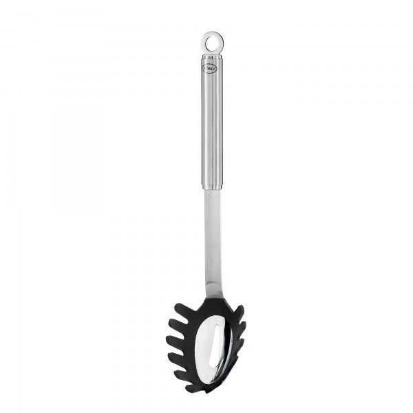 De roestvrijstalen spaghettilepel van Rösle is voorzien van een silicone, getande rand en een gat. Hierdoor roert, serveert en lift u gemakkelijk spaghetti en noedels. De lepel is na gebruik op te hangen.