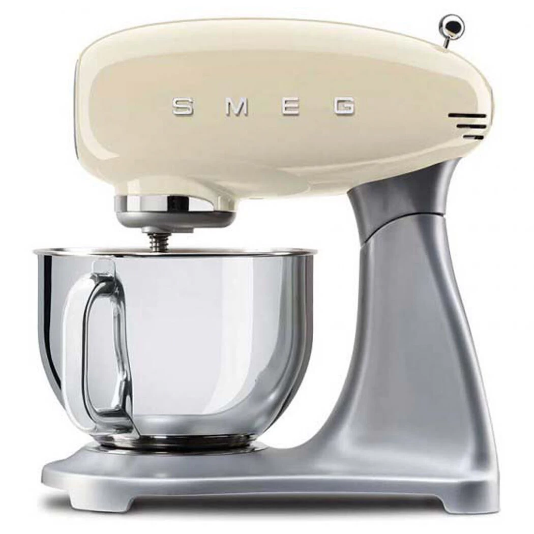 De crèmekleurige SMEG 50’s style standmixer is vervaardigd uit aluminium met een kunststof en geborsteld roestvrijstalen afwerking. De roestvrijstalen mengkom heeft een inhoud van 4,8 liter. De keukenmachine mengt, roert, klopt en kneedt met groot gemak uw deeg, beslag, saus of room.
