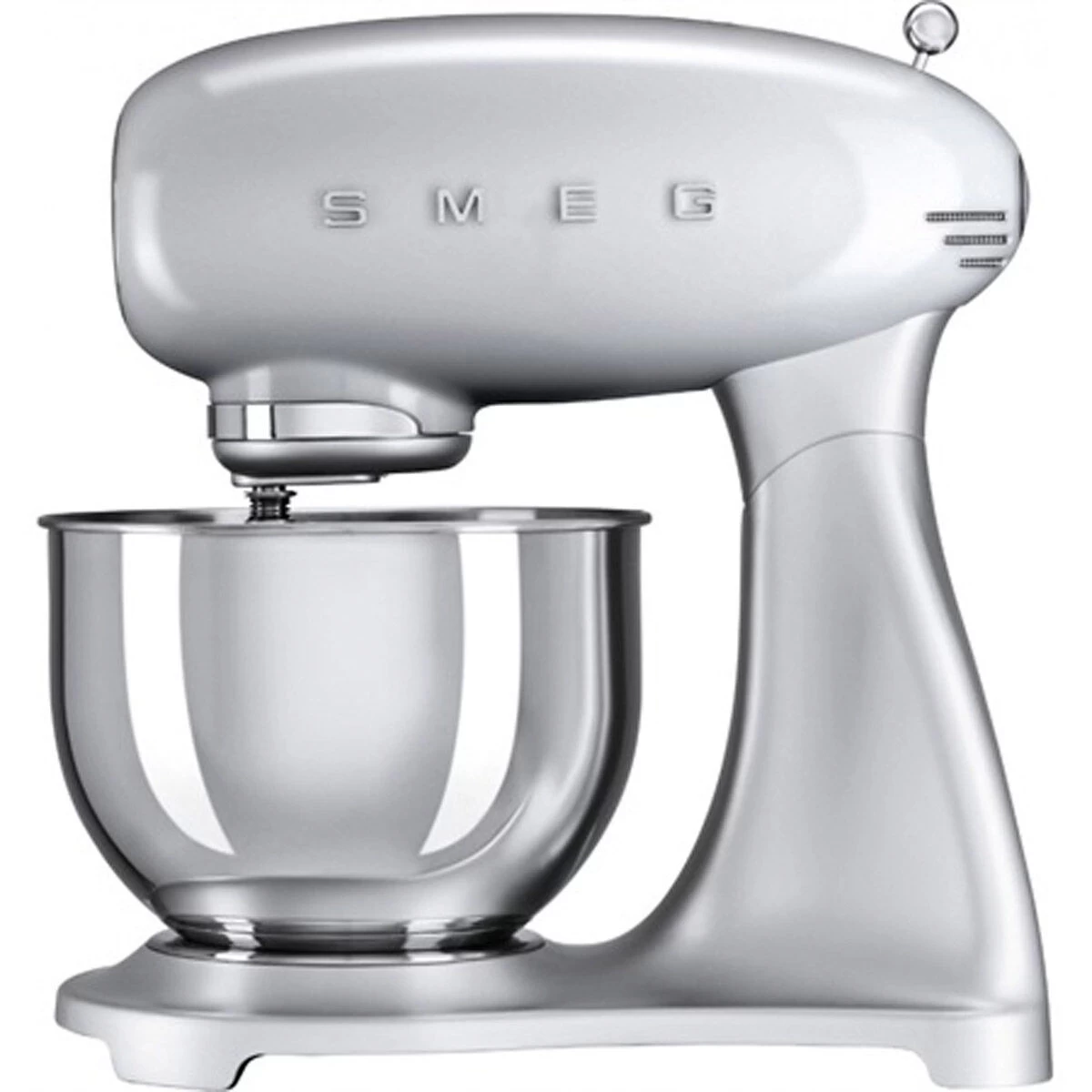 De grijze SMEG 50’s style standmixer is vervaardigd uit aluminium met een kunststof en geborsteld roestvrijstalen afwerking. De roestvrijstalen mengkom heeft een inhoud van 4,8 liter. De keukenmachine mengt, roert, klopt en kneedt met groot gemak uw deeg, beslag, saus of room.